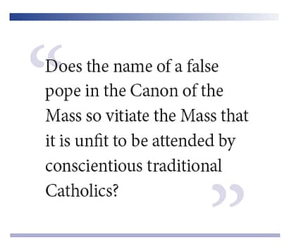Fr. Martin was a friend and supporter of The Reign of Mary magazine, making several contributions some years ago. Since he gave me permission to print any of his articles, I have decided to reprint this important article [in this issue of The Reign of Mary, #189], especially since the question of the lawfulness of attending such Masses seems to recur from time to time. Although Fr. Martin refers to Mass “una cum Benedicto” (since Benedict XVI was the false pope at the time of his writing); nevertheless, mutatis mutandis, the same principles apply today.
