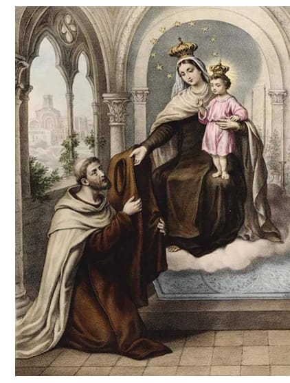 To understand the Sabbatine Privilege, we must first explain the great promise of the Brown Scapular of Our Lady of Mount Carmel. On July 16, 1251, our Blessed Mother appeared to St. Simon Stock, then general of the Carmelite Order, in Aylesford, England. She promised that those who die wearing the scapular of the Order (the Brown Scapular) would not suffer eternal fire. (This privilege granted to the religious of the Carmelite Order became accessible to the laity when the small scapular was approved.) Pope Pius XII referred to this apparition in 1951, when he stated: “Seven hundred years have passed since, according to the sacred traditions of the Carmelite family, Simon Stock was vouchsafed the vision of Our Lady of Mount Carmel” (AAS 43-589).