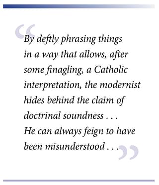 Modernists are famous (or rather, infamous) for writing ambiguous sentences with double meaning. A conservative will take the writing as being orthodox (although it usually takes some bending and “interpretation”), while a liberal sees the particular writing as supporting his cause (which, of course, is the real intention of the modernists). By deftly phrasing things in a way that allows, after some finagling, a Catholic interpretation, the modernists hide behind the claim of doctrinal soundness. If the liberals use these documents to support their cause, the modernist can always feign to have been misunderstood, while secretly rejoicing at the destruction of Catholic orthodoxy that results.