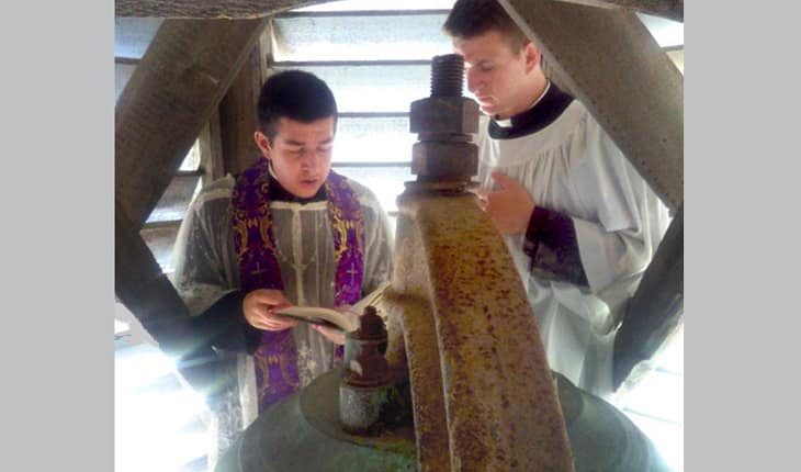 Posted on July 18, 2020July 18, 2020 by Sister Mary Agatha ← Previous Next → Through the attic to the tower, Fr. Borja blesses the bell at St. Joseph’s Church in Harmony, Minnesota.