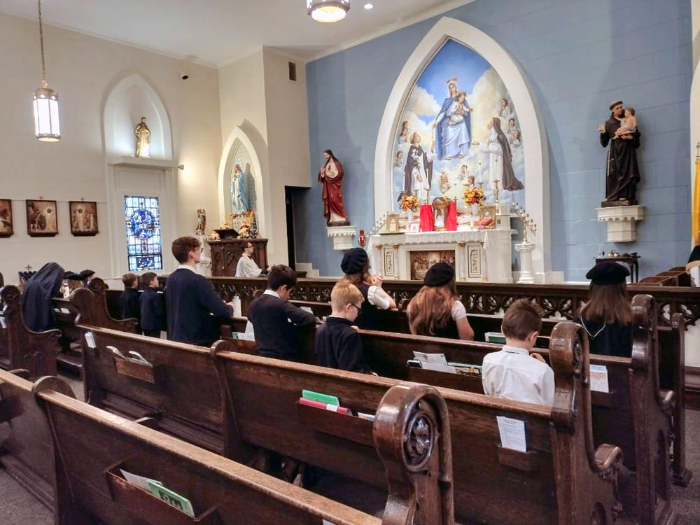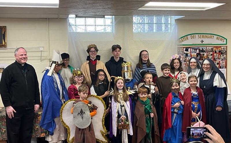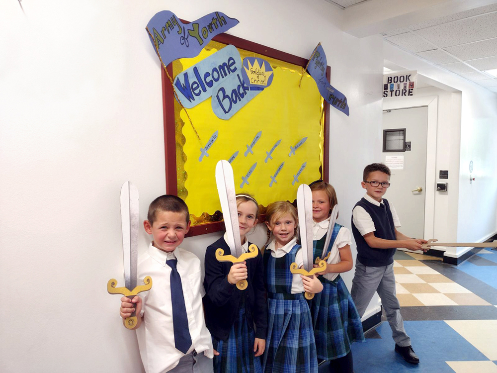 Students of St. Theresa’s School (Maine) learn more about the school theme and being “An Army of Youth” by getting to hold paper swords.