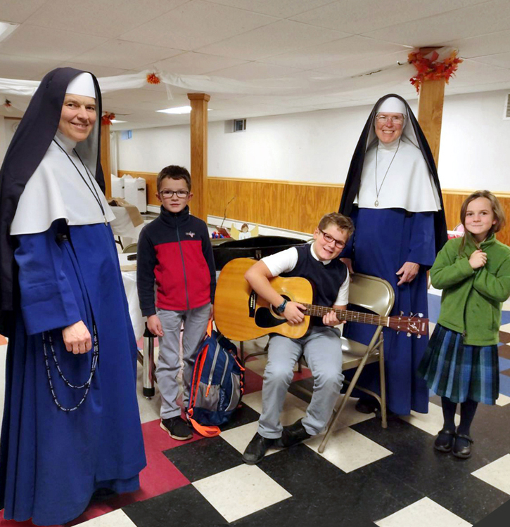Rev. Mother Mary Agnes visits the students of St. Theresa’s School (Oakland, Maine), one of whom is demonstrating his first quarter project of learning the guitar.