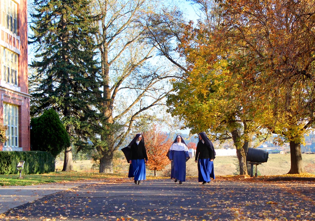 On a recreational walk, three Sisters enjoy the beautiful fall colors during Spokane’s Indian summer.