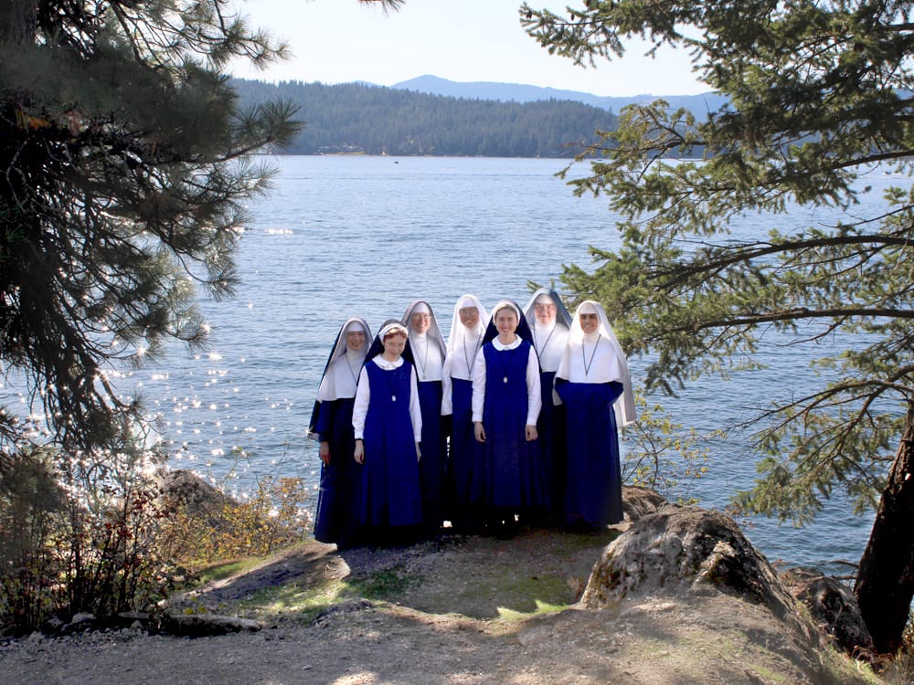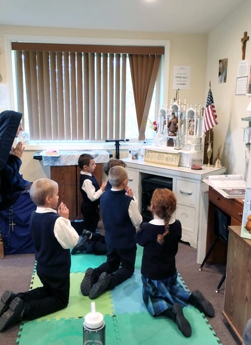 Kneeling at their classroom’s altar replica, Sr. Mary Josephine leads her kindergarteners in a prayer (Rathdrum, Idaho).