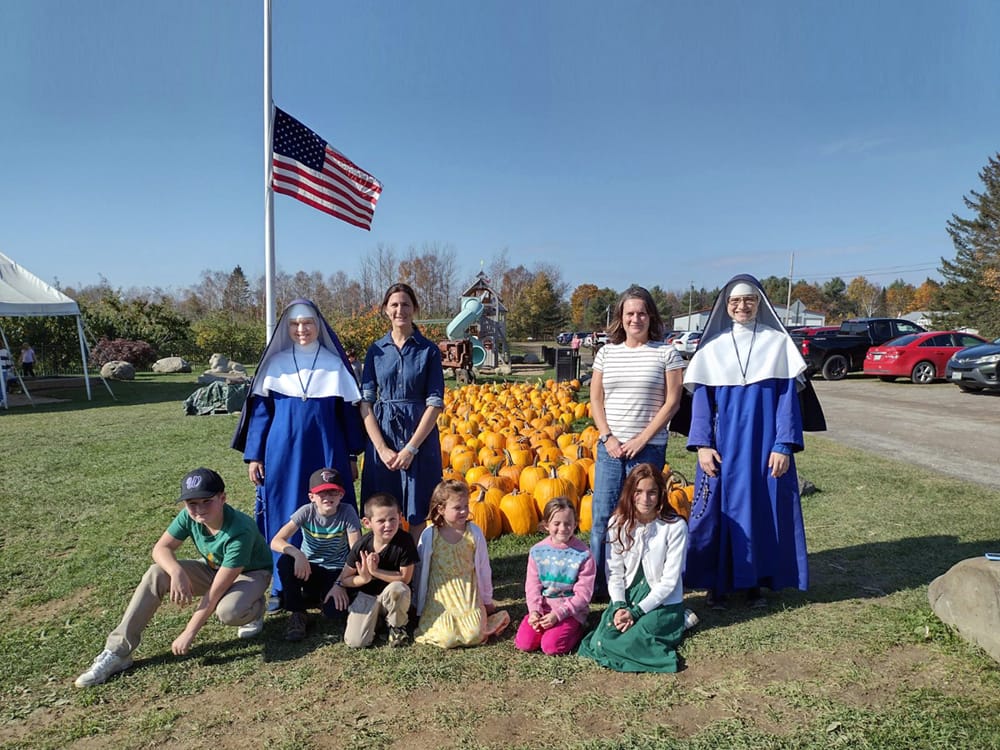 Sr. Maria Kazimiera and Sr. Mary Teresita and their students enjoy a warm autumn day at the pumpkin patch (Oakland, Maine).
