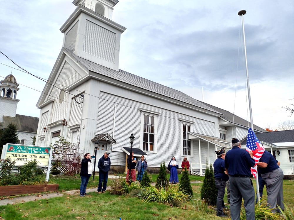 Proud to be an American! The local American Legion erects a flagpole for St. Theresa’s Church (Oakland, Maine), performing a military ceremony as they hang the flag for the first time.