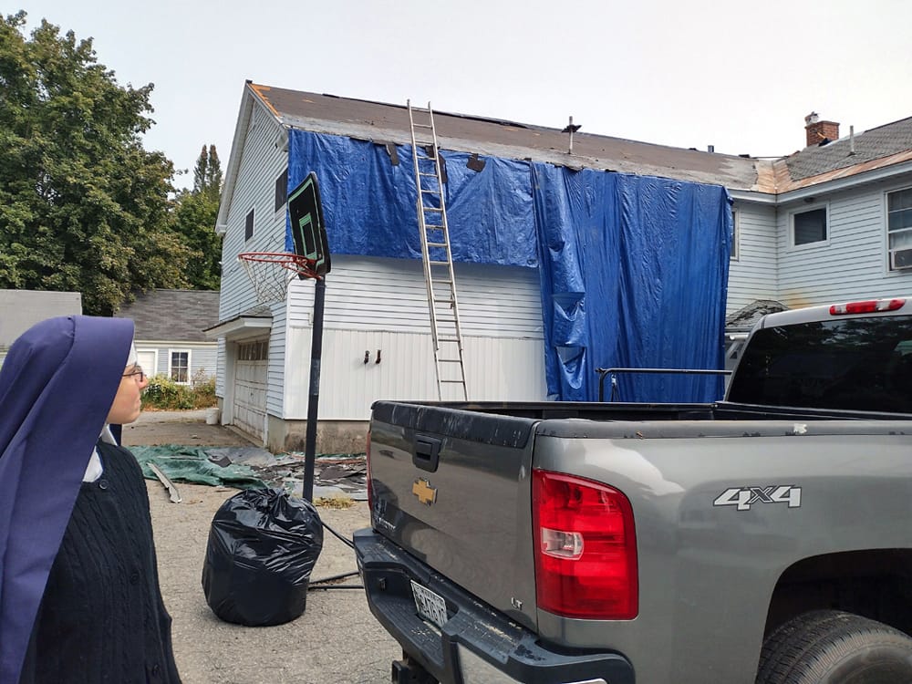Sr. Mary Teresita looks at the progress made on replacing the roof of the convent in Oakland, Maine.