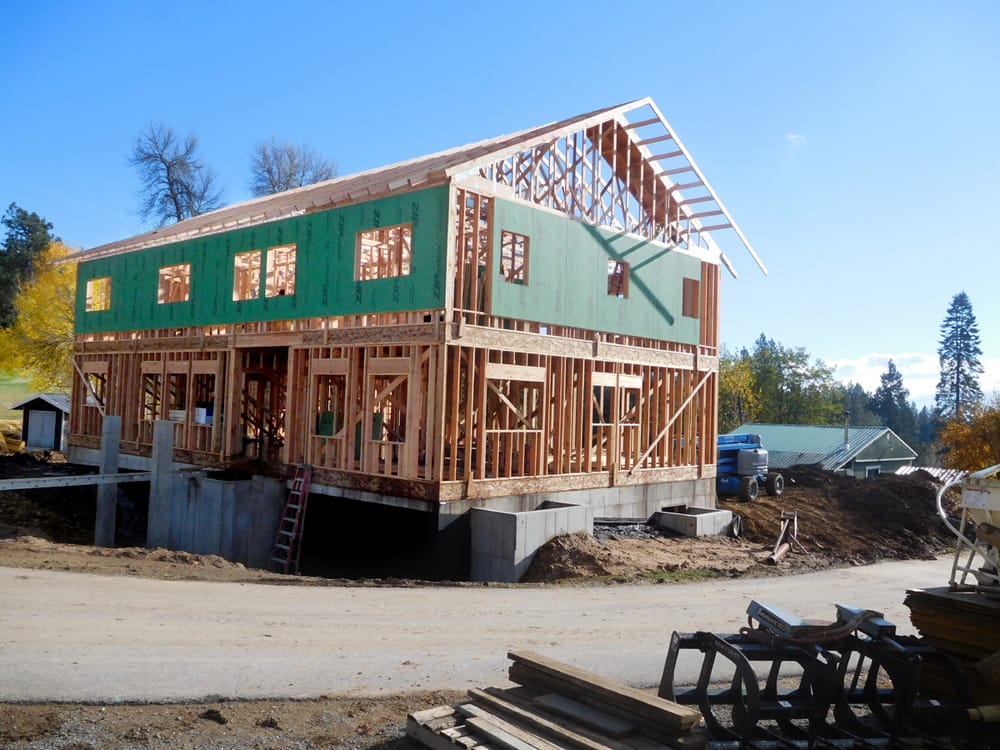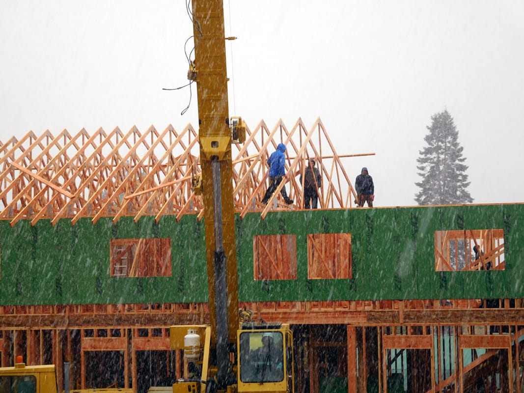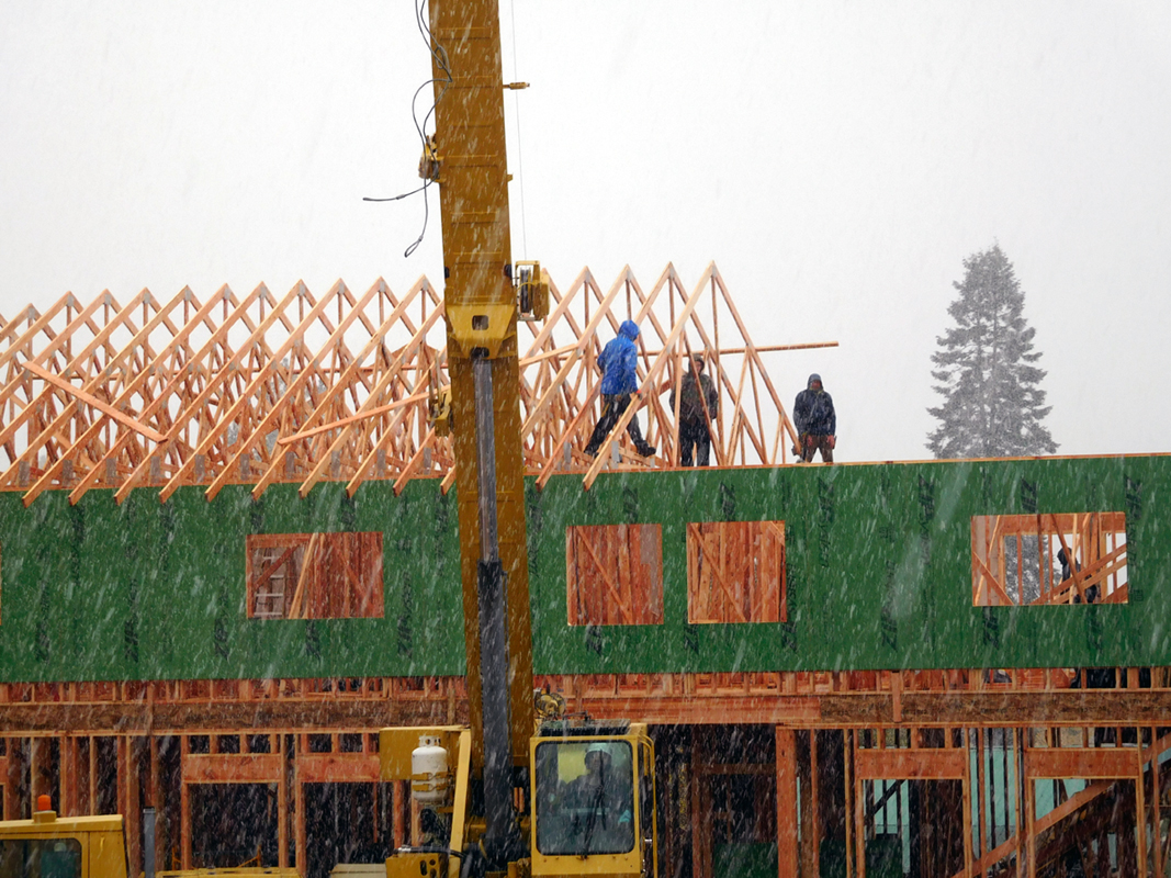 The men putting up the trusses in snow and cold rain! They had to do it that day because the crane was rented for the day at several hundred dollars an hour. (!!)