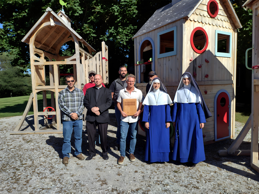 Fr. Letourneau, Sr. Mary Teresita and Sr. Maria Goretti with the owner of Cedar Works, who donated the new playground set for St. Theresa’s Church in Oakland, Maine.