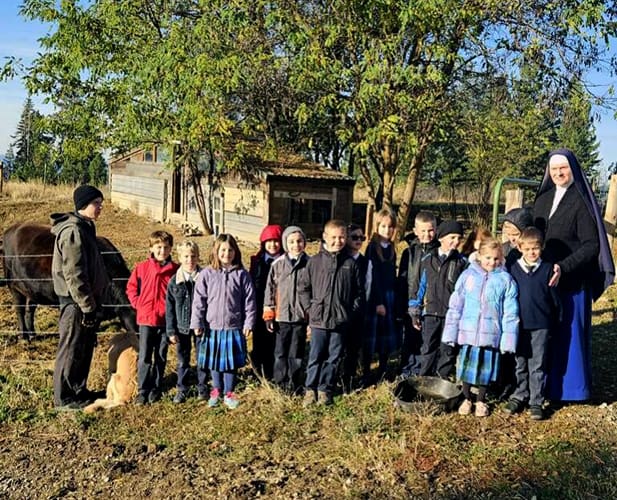 Sr. Mary Genevieve and the 1st, 2nd and 3rd graders visit the cow and the new calf on the seminary farm. Brother Simon and Felix, the seminary dog, came along.