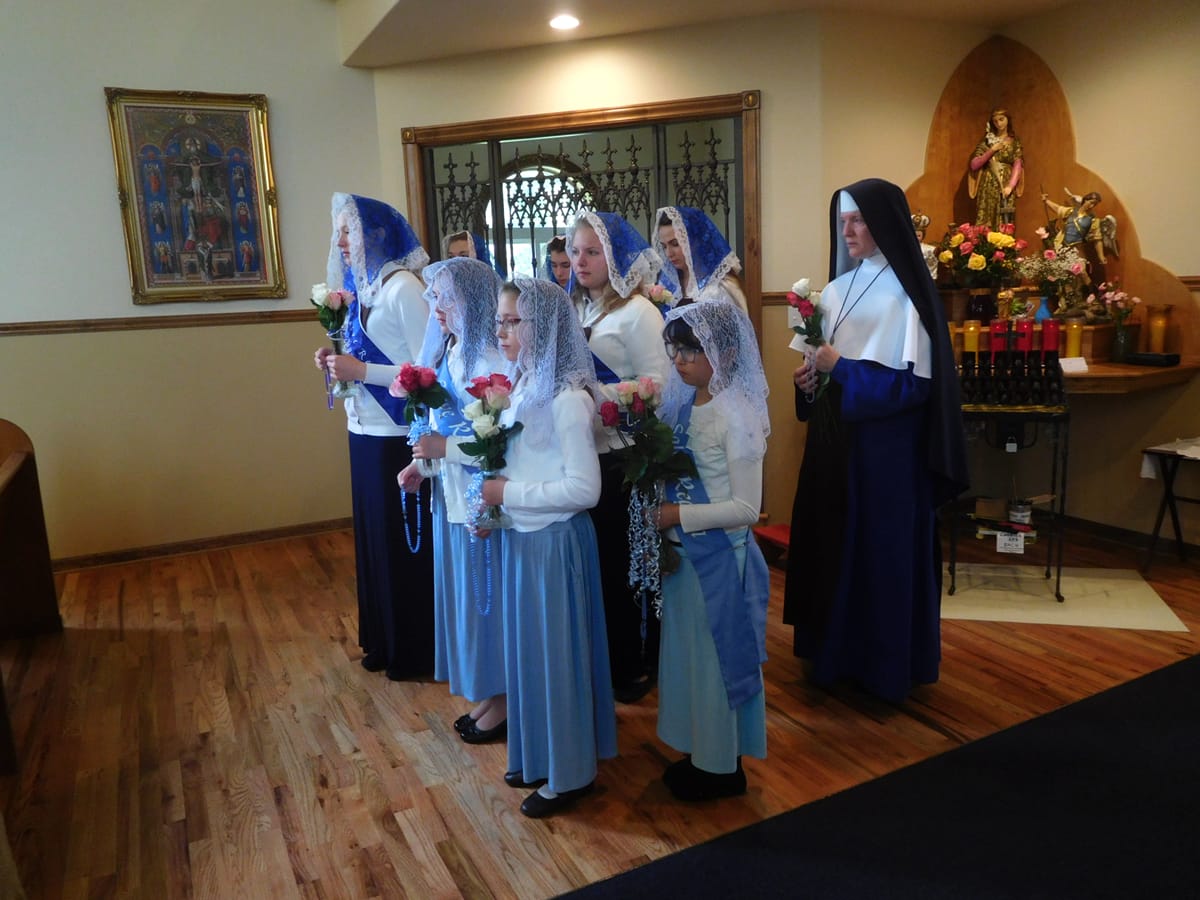Sr. Mary Genevieve joins the sodalists at Mary Immaculate Queen parish in presenting May flowers to Our Lady