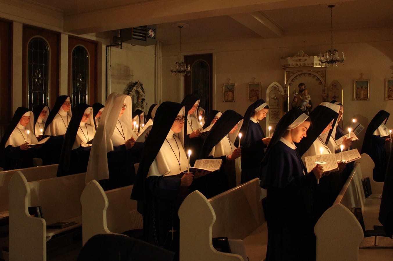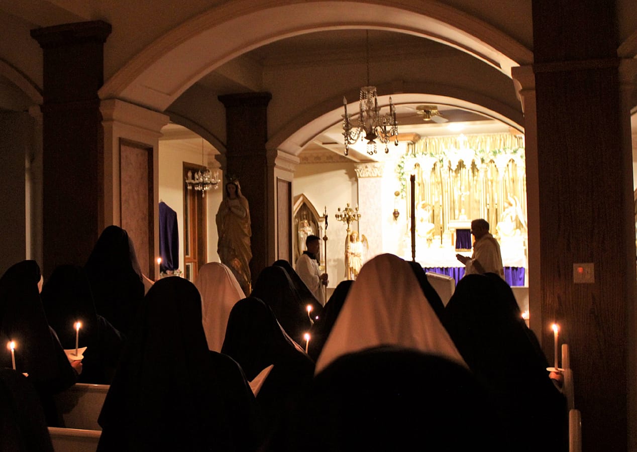 Holding their candles, lit from the Paschal candle flame, the Sisters follow along during the chanting of the Exultet at the Easter Vigil.