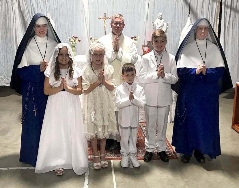 First Vows: Sr. Mary Lucy, Sr. Maria Goretti and Sr. Mariana wear crowns of red and white roses, symbolic of the life of purity and martyrdom they have chosen.