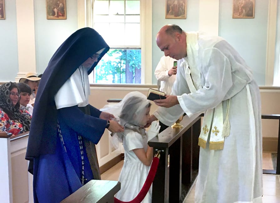 After making their first profession of simple vows, the four white-veiled novices receive the blue veils of the professed.