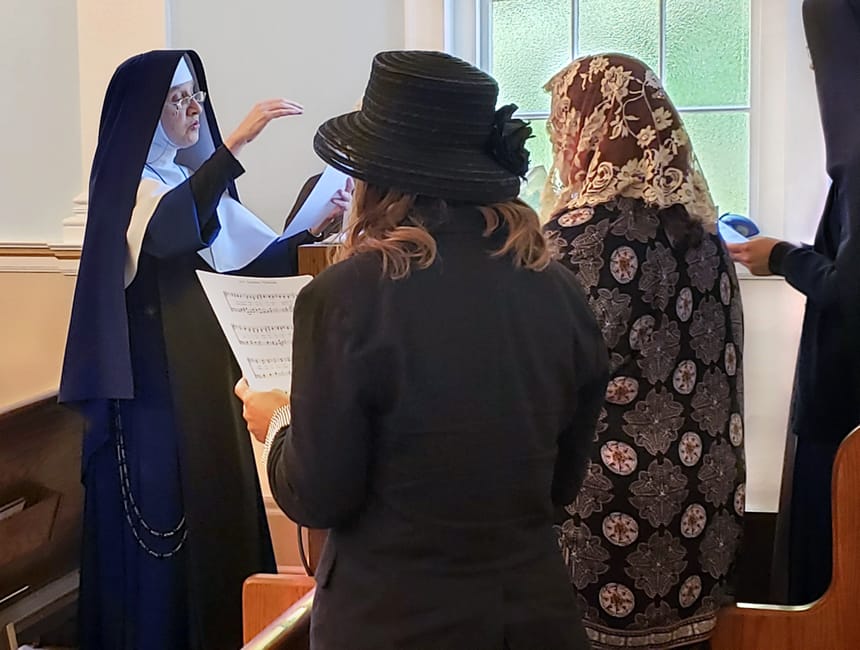 Sr. Mary Bernadette uses her vast music skills to direct, to sing, and to teach the choir in New England. On most missions, the Sisters lead the choir.