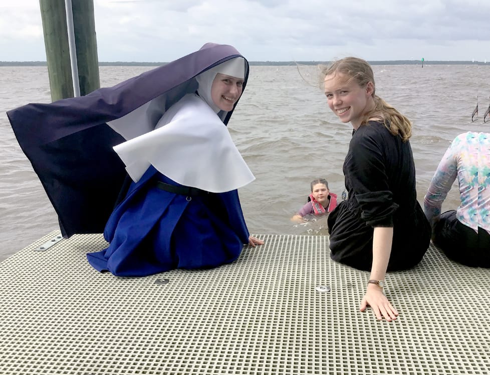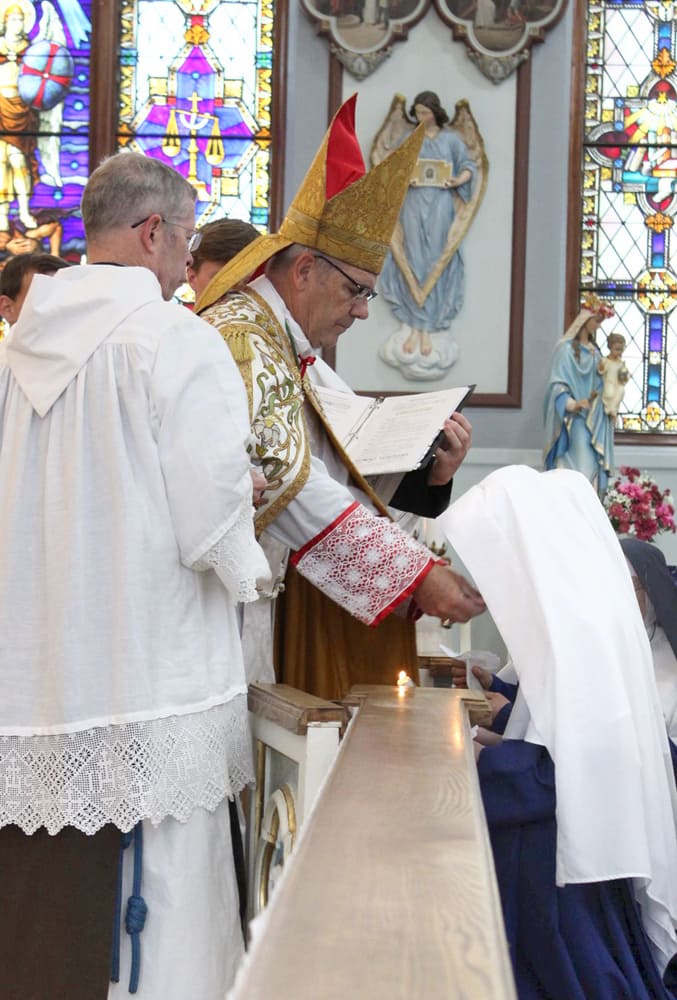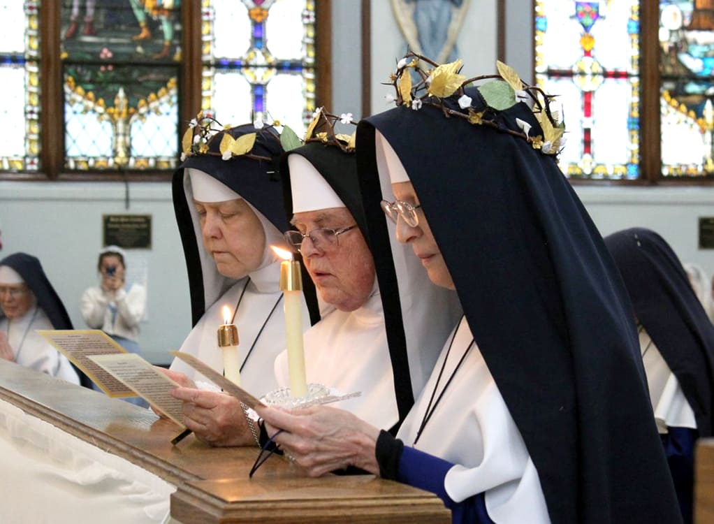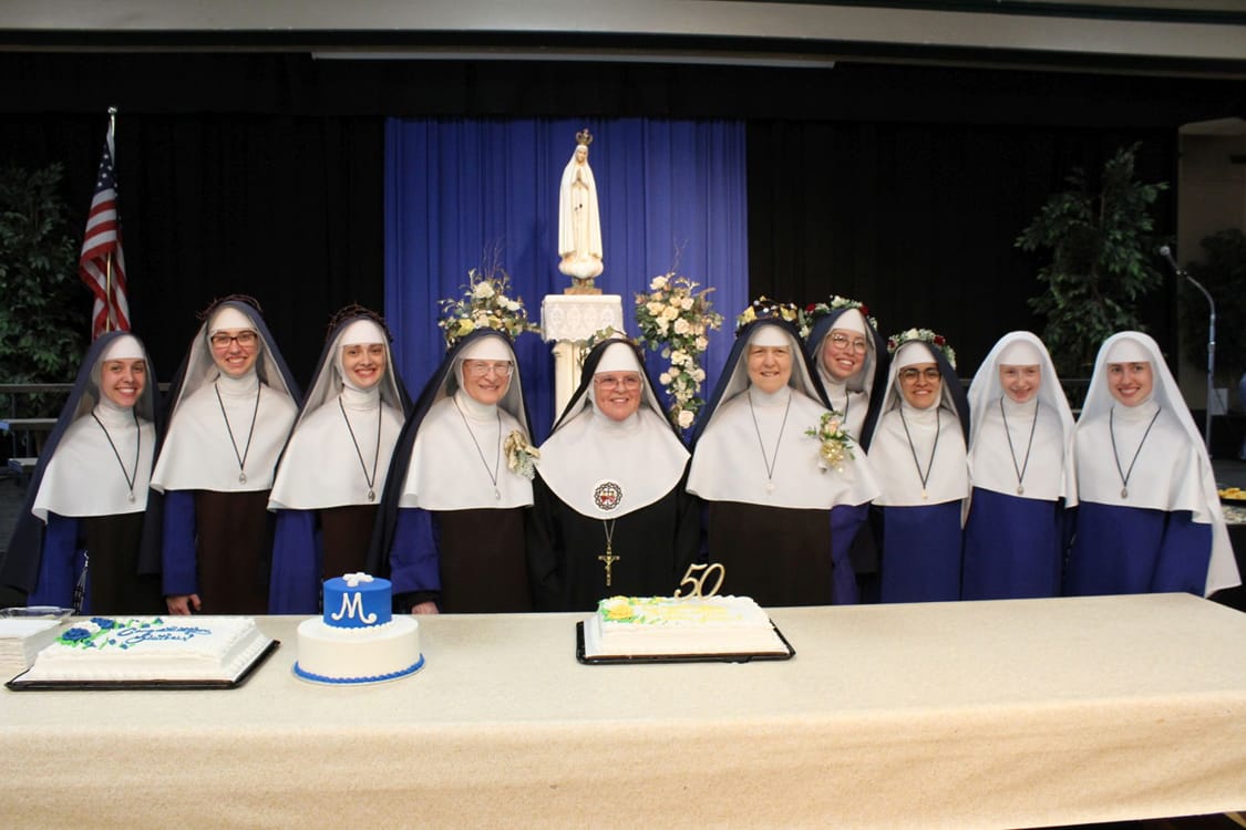 Sisters’ Summer 2024 Photos Return to Sisters' Newsletter Group photo after vows ceremonyThree golden jubiliariansNew novicesCutting hairPetition for Renewal of VowsTriennial VowsFirst Vows: blue veilFirst VowsReceiving the ringPerpetual VowsRecessional after vows ceremonyProcession of nunsHigh Mass during Ladies RetreatForest walkTour of silver mineNuns working in gardenClimbing through a rock creviceNuns on stairsCamp St. PhilomenaTwo Sisters enjoy a boat rideCatechism in MaineTiny organistGirls camp in MississippiPicking blueberries