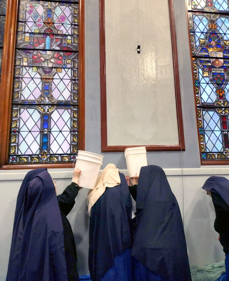 Sisters rushed to help when sub-zero temperatures caused a pipe to freeze above the ceiling of Mount St. Michael’s chapel, resulting in a waterfall.
