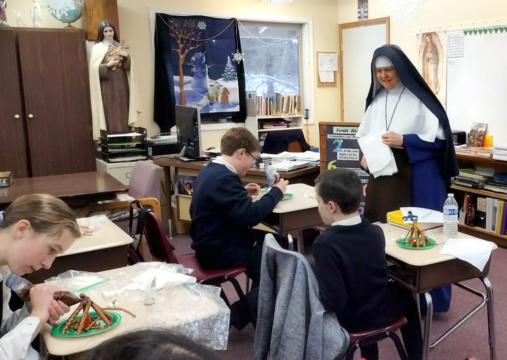 Sr. Mary Imelda oversees her students as they make edible campfires out of pretzels.