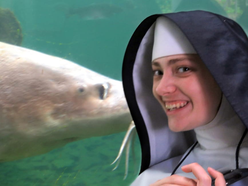 Posted on September 10, 2021September 10, 2021 by Sister Mary Agatha ← Previous Next → Um, Sister, there is something creepy behind you. During their outing in Oregon, the Novitiate Sisters visited a fish hatchery. Sr. Maria Dolorosa poses with 11-foot-long, 70-year-old “Herman the Sturgeon.”