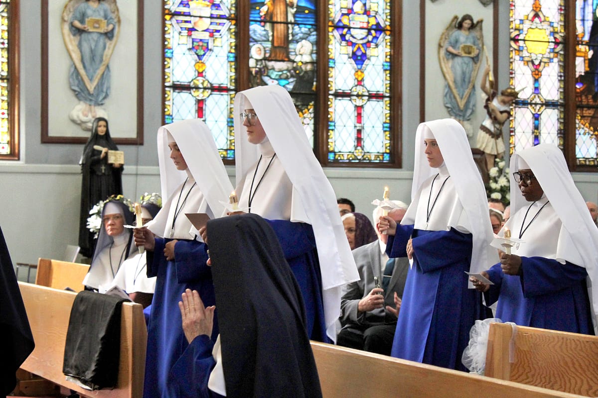 Posted on September 10, 2025September 10, 2025 by Sister Mary Agatha ← Previous Next → Our four new novices approach the altar, where they will receive their new names and their copies of the Holy Rule.
